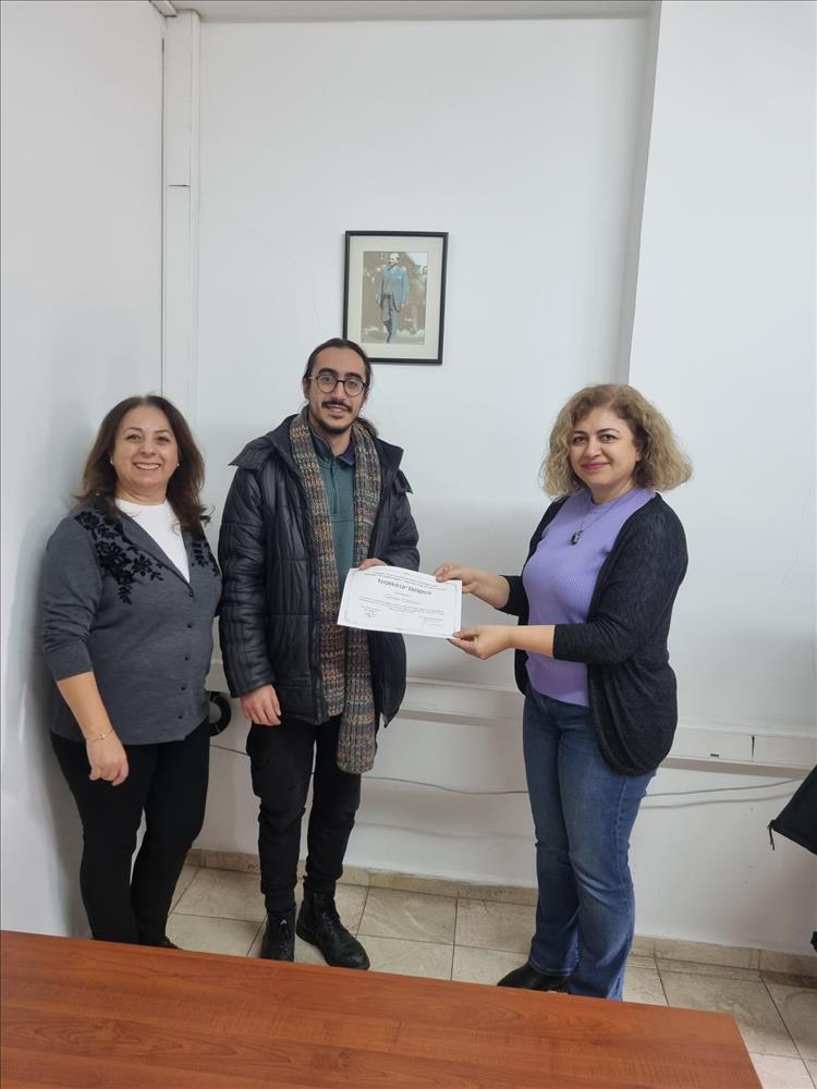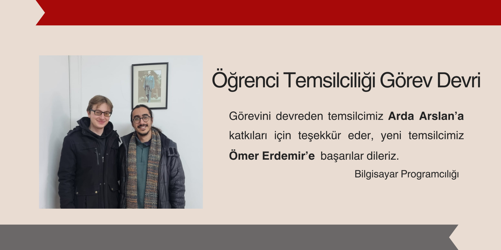 Programımızda yapılan öğrenci temsilcisi seçimi sonucunda yeni öğrenci temsilcisi belirlenmiş ve görev devir teslimi gerçekleştirilmiştir. Bu kapsamda, önceki öğrenci temsilcimiz Arda Arslan görevini yeni seçilen öğrenci temsilcimiz Ömer Erdemir'e devretmiştir. Görev süresi boyunca bölümümüzün akademik ve idari süreçlerine sağladığı katkılar dolayısıyla önceki öğrenci temsilcimize teşekkür ederken, yeni öğrenci temsilcimize görevinde başarılar diliyoruz.